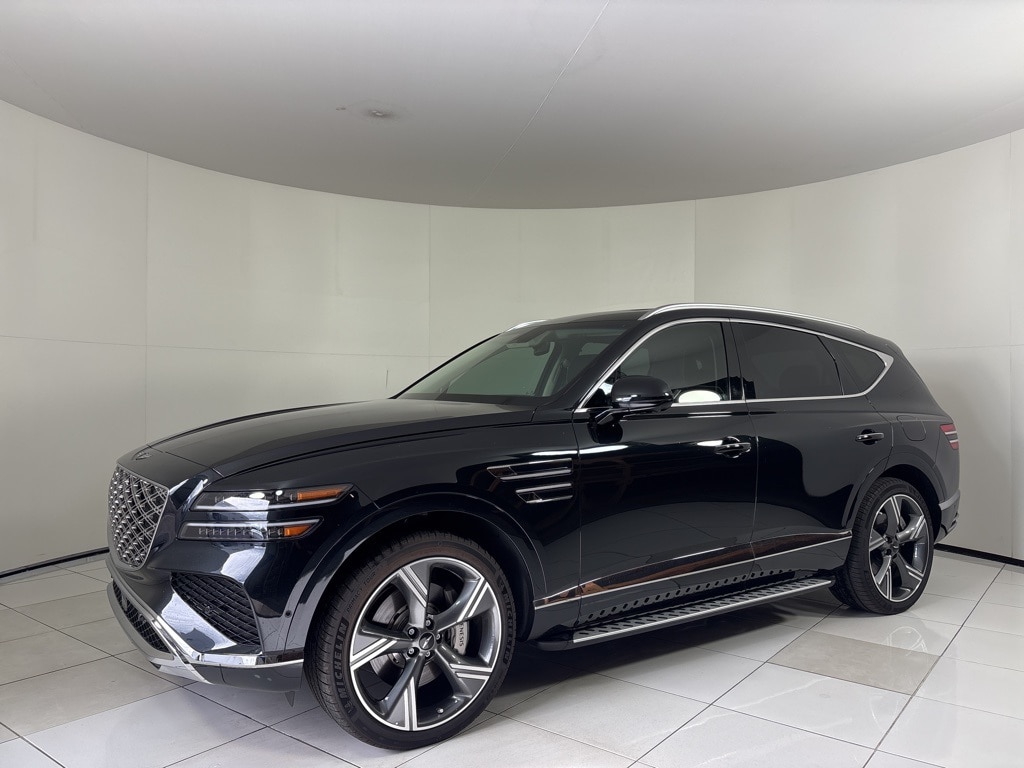 This GV80 is well equipped with Option Group 01, 18 Speakers, 4-Wheel Disc Brakes, ABS brakes, Adaptive suspension, Air Conditioning, Alloy wheels, AM/FM radio: SiriusXM, Anti-whiplash front head restraints, Auto High-beam Headlights, Auto tilt-away steering wheel, Auto-dimming door mirrors, Auto-dimming Rear-View mirror, Automatic temperature control, Brake assist, Bumpers: body-color, Compass, Delay-off headlights, Driver door bin, Driver vanity mirror, Dual front impact airbags, Dual front side impact airbags, Electronic Stability Control, Emergency communication system: Genesis Connected Services, Exterior Parking Camera Rear, Four wheel independent suspension, Fragrance Cartridge, Front anti-roll bar, Front Bucket Seats, Front Center Armrest, Front dual zone A/C, Front reading lights, Fully automatic headlights, Garage door transmitter: HomeLink, Genuine wood console insert, Genuine wood dashboard insert, Genuine wood door panel insert, Heads-Up Display, Heated & Ventilated Front Bucket Seats, Heated door mirrors, Heated front seats, Heated rear seats, Heated steering wheel, Illuminated entry, Knee airbag, Leather Seating Surfaces, Leather steering wheel, Low tire pressure warning, Memory seat, Navigation System, Occupant sensing airbag, Outside temperature display, Overhead airbag, Overhead console, Panic alarm, Passenger door bin, Passenger vanity mirror, Power door mirrors, Power driver seat, Power Liftgate, Power moonroof, Power passenger seat, Power steering, Power windows, Radio data system, Radio: AM/FM/SiriusXM/HD Bang & Olufsen Sound Sys, Rain sensing wipers, Rear air conditioning, Rear anti-roll bar, Rear reading lights, Rear seat center armrest, Rear side impact airbag, Rear window defroster, Rear window wiper, Remote keyless entry, Security system, Side Step, Speed control, Speed-sensing steering, Speed-Sensitive Wipers, Split folding rear seat, Spoiler, Steering wheel memory, Steering wheel mounted audio controls, Tachometer, Telescoping steering wheel, Tilt steering wheel, Traction control, Trip computer, Turn signal indicator mirrors, Variably intermittent wipers, Ventilated front seats, and Wheels: 22" x 9.5J Dark Gray Matte Alloy.