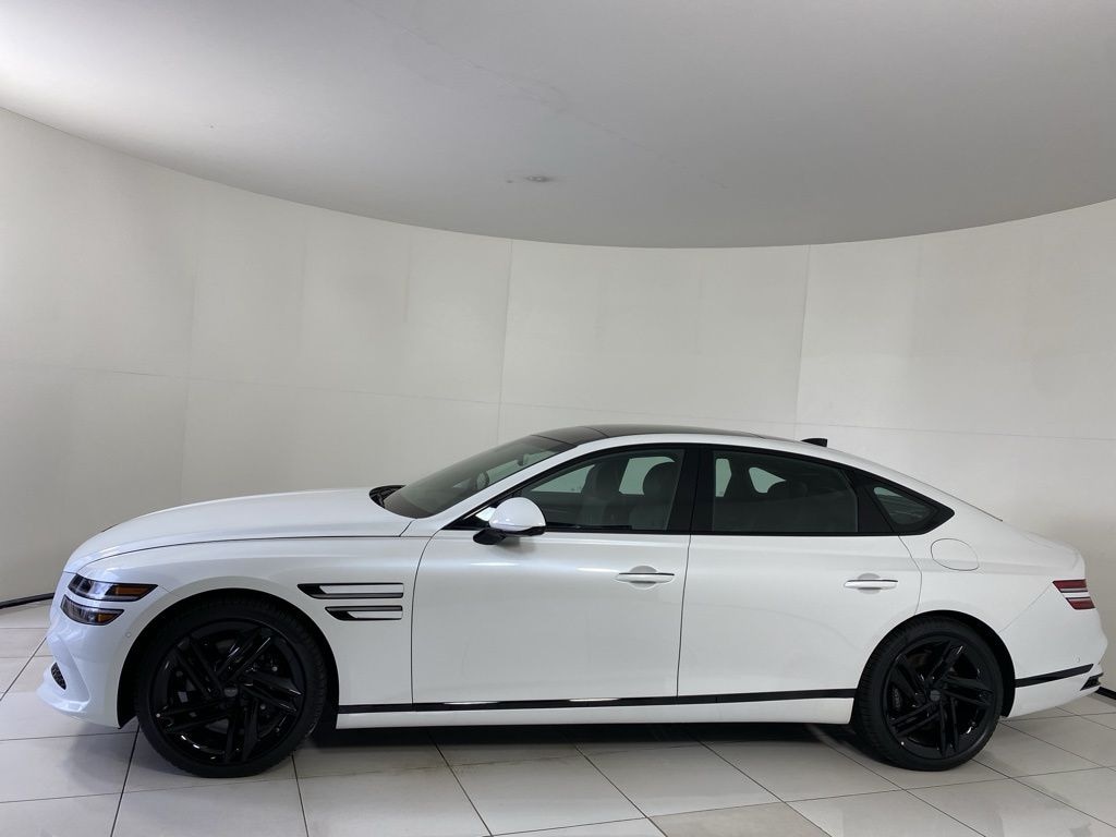 This G80 is well equipped with Option Group 01, G80 3.5T, 4D Sedan, 3.5L V6 PDI Turbocharged DOHC 24V LEV3-ULEV50 375hp, 8-Speed Automatic, AWD, Uyuni White, Obsidian Black Leather, 18 Speakers, 4-Wheel Disc Brakes, ABS brakes, Adaptive suspension, Air Conditioning, Alloy wheels, AM/FM radio: SiriusXM, Android Auto & Apple CarPlay, Anti-whiplash front head restraints, Auto High-beam Headlights, Auto tilt-away steering wheel, Auto-dimming door mirrors, Auto-dimming Rear-View mirror, Automatic temperature control, Bumpers: body-color, Cargo Mat, Compass, Delay-off headlights, Driver door bin, Driver vanity mirror, Dual front impact airbags, Dual front side impact airbags, Electronic Stability Control, Emergency communication system: Genesis Connected Services, Exterior Parking Camera Rear, First Aid Kit, Four wheel independent suspension, Front anti-roll bar, Front Bucket Seats, Front Center Armrest, Front dual zone A/C, Front reading lights, Fully automatic headlights, Garage door transmitter: HomeLink, Genuine wood console insert, Genuine wood dashboard insert, Genuine wood door panel insert, Heads-Up Display, Heated and Ventilated Front Bucket Seats, Heated door mirrors, Heated front seats, Heated rear seats, Heated steering wheel, Illuminated entry, Knee airbag, Leather steering wheel, Low tire pressure warning, Memory seat, Nappa Leather Seating Surfaces, Navigation System, NFC Key Card, Occupant sensing airbag, Outside temperature display, Overhead airbag, Overhead console, Panic alarm, Passenger door bin, Passenger vanity mirror, Power door mirrors, Power driver seat, Power moonroof, Power passenger seat, Power steering, Power windows, Radio data system, Rain sensing wipers, Rear air conditioning, Rear anti-roll bar, Rear reading lights, Rear seat center armrest, Rear side impact airbag, Rear Window Blind, Rear window defroster, Remote keyless entry, Roadside Assistance Kit, Security system, Speed control, Speed-sensing steering, Speed-Sensitive Wipers, Steering wheel memory, Steering wheel mounted audio controls, Tachometer, Telescoping steering wheel, Tilt steering wheel, Traction control, Trip computer, Turn signal indicator mirrors, Variably intermittent wipers, Ventilated front seats, and Wheels: 20" x 8.5J Fr & 20" x 9.5J Rr Black Alloy plus G80 3.5T, 4D Sedan, 3.5L V6 PDI Turbocharged DOHC 24V LEV3-ULEV50 375hp, 8-Speed Automatic, AWD, Uyuni White, and Obsidian Black Leather.