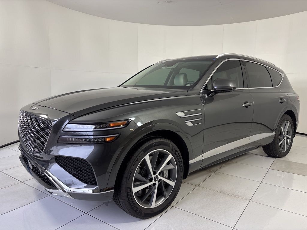 This GV80 is well equipped with Option Group 01, 18 Speakers, 3rd row seats: split-bench, 4-Wheel Disc Brakes, ABS brakes, Adaptive suspension, Air Conditioning, Alloy wheels, AM/FM radio: SiriusXM, Anti-whiplash front head restraints, Auto High-beam Headlights, Auto tilt-away steering wheel, Auto-dimming door mirrors, Auto-dimming Rear-View mirror, Automatic temperature control, Brake assist, Bumpers: body-color, Cargo Blocks, Compass, Delay-off headlights, Driver door bin, Driver vanity mirror, Dual front impact airbags, Dual front side impact airbags, Electronic Stability Control, Emergency communication system: Genesis Connected Services, Exterior Parking Camera Rear, Four wheel independent suspension, Fragrance Cartridge, Front anti-roll bar, Front Bucket Seats, Front Center Armrest, Front dual zone A/C, Front reading lights, Fully automatic headlights, Garage door transmitter: HomeLink, Genuine wood console insert, Genuine wood dashboard insert, Genuine wood door panel insert, Heads-Up Display, Heated and Ventilated Front Bucket Seats, Heated door mirrors, Heated front seats, Heated rear seats, Heated steering wheel, Illuminated entry, Knee airbag, Leather Seating Surfaces, Leather steering wheel, Low tire pressure warning, Memory seat, Navigation System, Occupant sensing airbag, Outside temperature display, Overhead airbag, Overhead console, Panic alarm, Passenger door bin, Passenger vanity mirror, Power door mirrors, Power driver seat, Power Liftgate, Power moonroof, Power passenger seat, Power steering, Power windows, Radio data system, Radio: AM/FM/HD Bose Premium Sound System, Rain sensing wipers, Rear air conditioning, Rear anti-roll bar, Rear reading lights, Rear seat center armrest, Rear side impact airbag, Rear window defroster, Rear window wiper, Reclining 3rd row seat, Remote keyless entry, Security system, Speed control, Speed-sensing steering, Speed-Sensitive Wipers, Split folding rear seat, Spoiler, Steering wheel memory, Steering wheel mounted audio controls, Tachometer, Telescoping steering wheel, Tilt steering wheel, Traction control, Trip computer, Turn signal indicator mirrors, Variably intermittent wipers, Ventilated front seats, and Wheels: 20" x 8.5J Dark Gray Matte Alloy plus.
