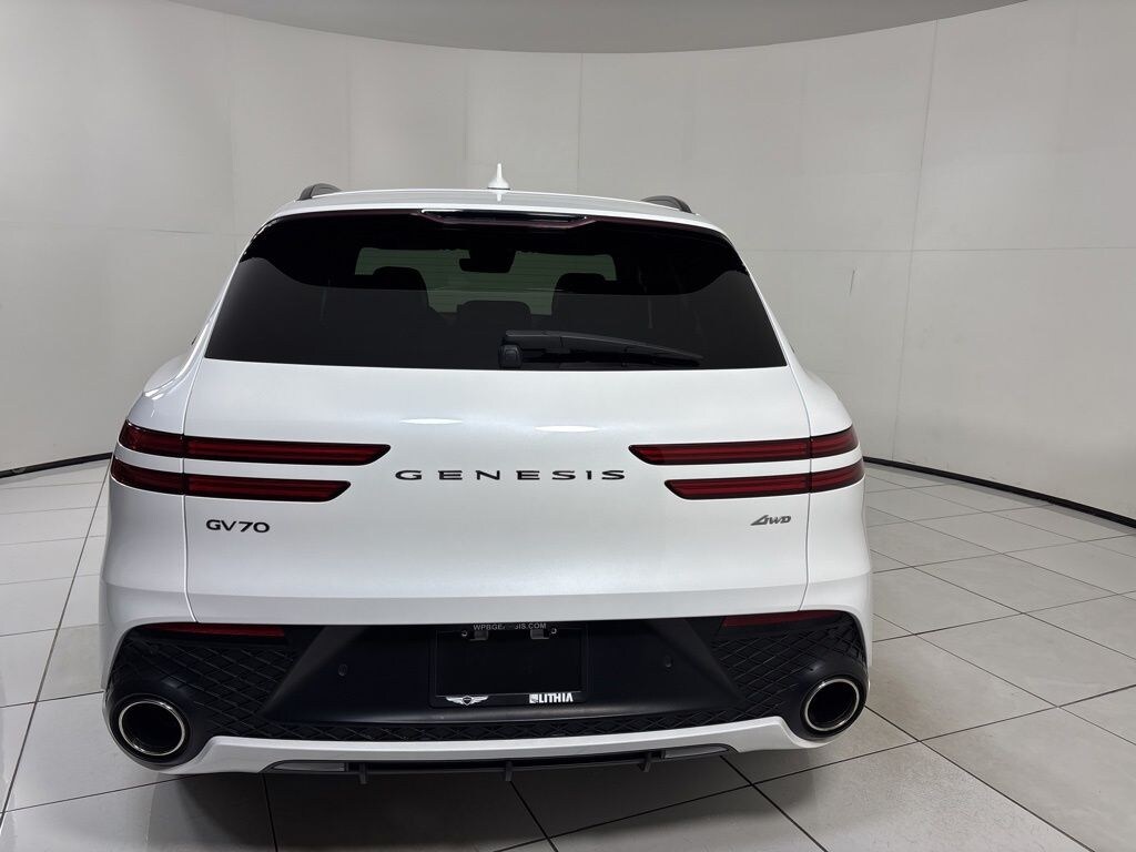 This GV70 is well equipped with Sport Appearance, Sport Prestige Package (12.3" 3D Digital Instrument Cluster, 3-Zone Climate Control, Alloy Pedals, Aluminum Trim w/Haptic Carbon Pattern, Ergo Motion Seat, Forward Attention Warning, Genesis Digital Key, Leather Seating Surfaces w/Mesh Insert, Leatherette Wrapped Upper Instrument Panel, Lexicon Premium Audio, Manual Rear Door Shades, Option Group 04, Power Driver Seat Bolster & Cushion Extension, Remote Smart Parking Assist, Ventilated Front Seats, and Wheels: 21" Dark Sputtering Sport Alloy), GV70 2.5T, 4D Sport Utility, 2.5L DOHC, 8-Speed Automatic with SHIFTRONIC, AWD, Uyuni White, Black/Black Leather, 4-Wheel Disc Brakes, 4.181 Axle Ratio, 9 Speakers, ABS brakes, Air Conditioning, Alloy wheels, Aluminum Trim w/Spin Brushed Pattern, AM/FM radio: SiriusXM, Android Auto & Apple CarPlay, Anti-whiplash front head restraints, Auto High-beam Headlights, Auto-dimming Rear-View mirror, Automatic temperature control, Brake assist, Bumpers: body-color, Cargo Cover, Delay-off headlights, Driver door bin, Driver vanity mirror, Dual front impact airbags, Dual front side impact airbags, Electronic Stability Control, Emergency communication system: Genesis Connected Services, Exterior Parking Camera Rear, First Aid Kit, Four wheel independent suspension, Front a