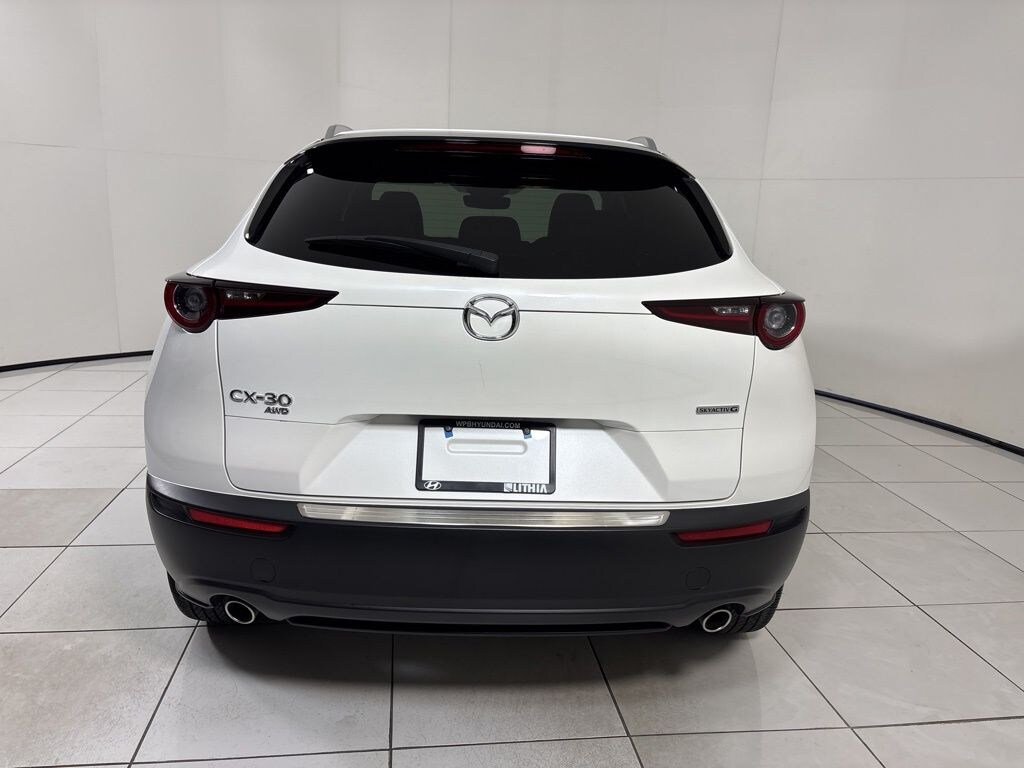 This Mazda CX-30 is well equipped with CX-30 2.5 S Preferred Package, 4D Sport Utility, SKYACTIV® 2.5L 4-Cylinder DOHC 16V, 6-Speed Automatic, AWD, Snowflake White Pearl Mica, Black Premium Synthetic, 4-Wheel Disc Brakes, 4.095 Axle Ratio, 6 Speakers, ABS brakes, Air Conditioning, Alloy wheels, AM/FM radio, AppLink/Apple CarPlay and Android Auto, Auto High-beam Headlights, Automatic temperature control, Brake assist, Bumpers: body-color, Compass, Delay-off headlights, Driver door bin, Driver vanity mirror, Dual front impact airbags, Dual front side impact airbags, Electronic Stability Control, Emergency communication system: Mazda Connected Services (3-year complimentary trial included), Exterior Parking Camera Rear, Front anti-roll bar, Front Bucket Seats, Front Center Armrest, Front dual zone A/C, Front reading lights, Front wheel independent suspension, Fully automatic headlights, Heated door mirrors, Heated Front Bucket Seats, Heated front seats, Illuminated entry, Knee airbag, Leather Shift Knob, Leather steering wheel, Leatherette Seat Trim, Low tire pressure warning, MAZDA CONNECT Infotainment System, Memory seat, Occupant sensing airbag, Outside temperature display, Overhead airbag, Overhead console, Panic alarm, Passenger door bin, Passenger vanity mirror, Power door mirrors, Power driver seat, Power moonroof, Power steering, Power windows, Radio data system, Radio: AM/FM Audio System, Rain sensing wipers, Rear seat center armrest, Rear side impact airbag, Rear window defroster, Rear window wiper, Remote keyless entry, Snowflake White Pearl Mica Paint Charge, Speed control, Speed-sensing steering, Split folding rear seat, Spoiler, Stainless Steel Rear Bumper Guard, Steering wheel mounted audio controls, Tachometer, Telescoping steering wheel, Tilt steering wheel, Traction control, Trip computer, Tu